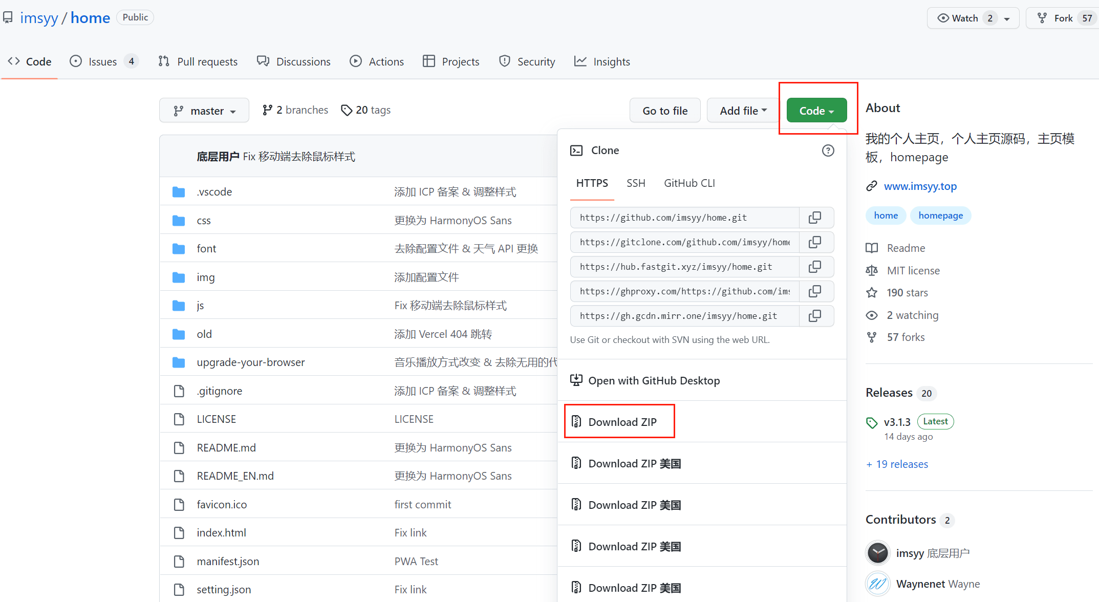 进入项目主页,点击右上角的Code按钮,再点击Download ZIP