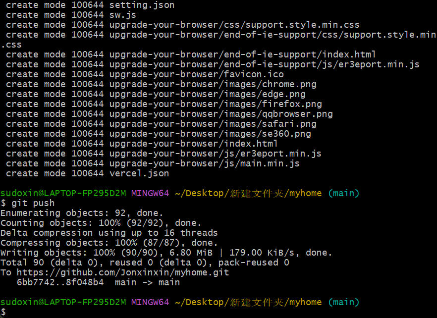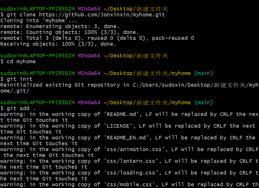 依次输入以下命令,将整个文件夹上传到 GitHub