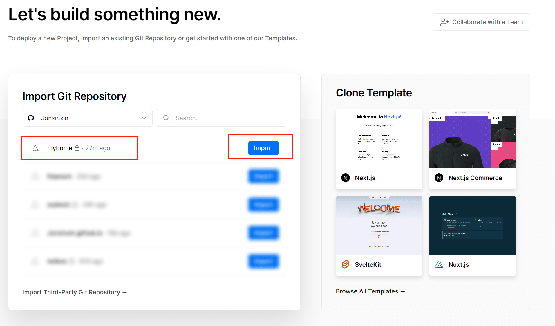 绑定好后这里会出现绑定的 GitHub 下的所有项目,点击 Import 可以直接导入到 Vercel