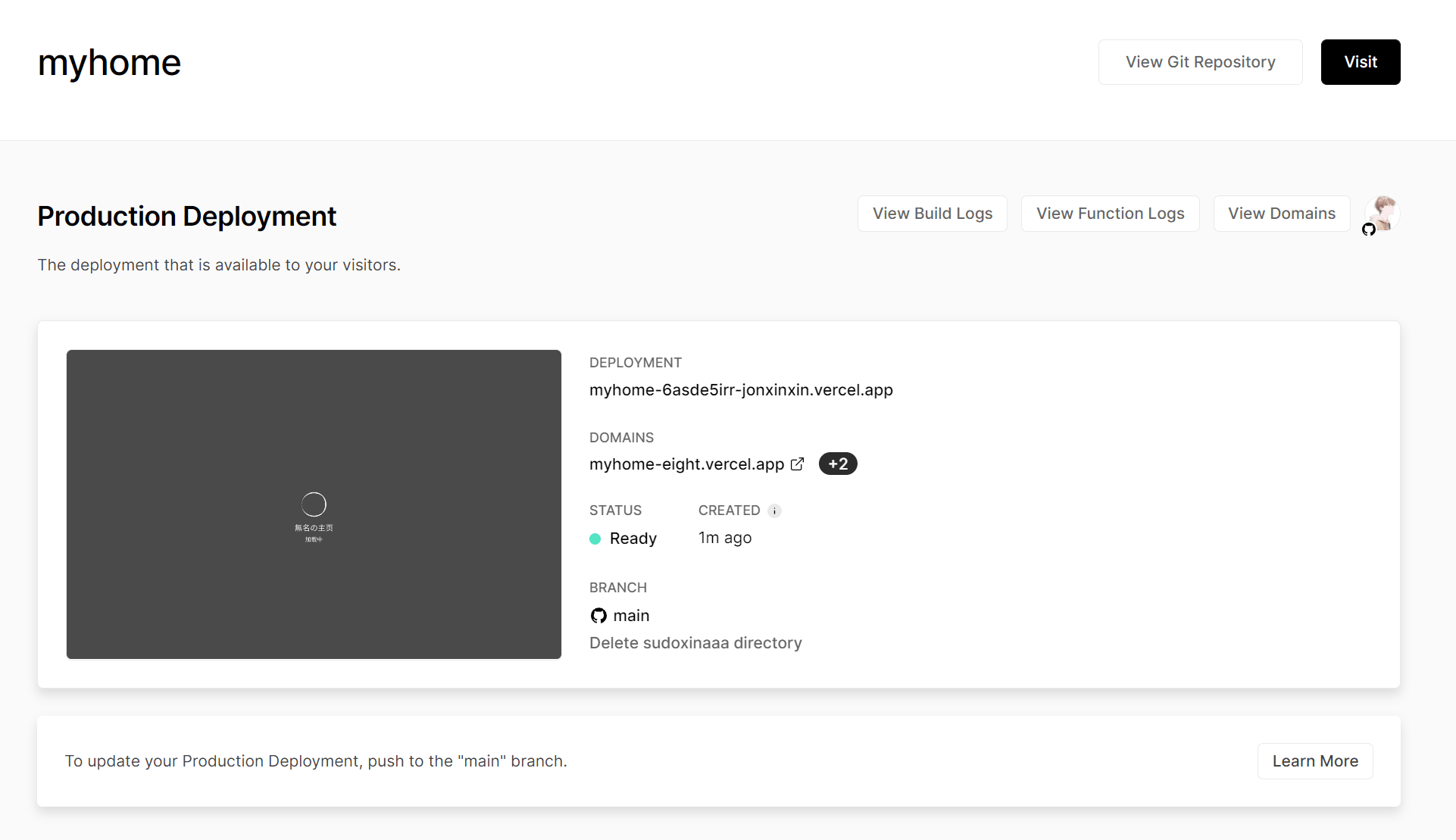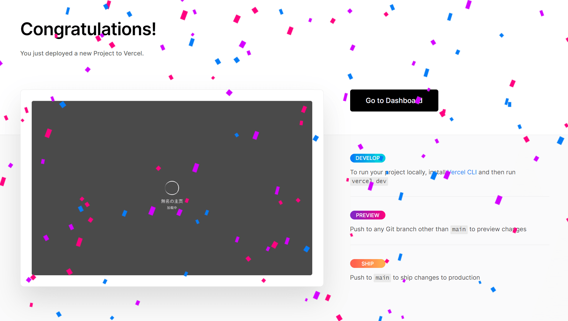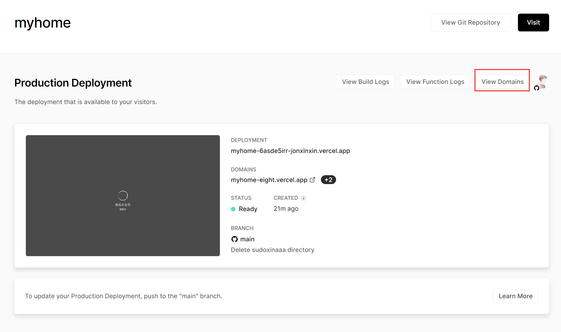 点击 Go to Dashboard 进入控制台,可以看到 Vercel 默认给我们分配了一个域名