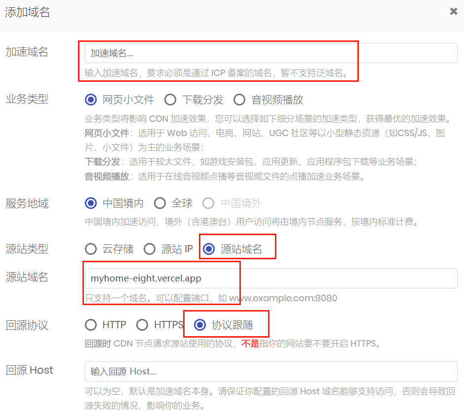 其中, 源站域名 为刚刚 Vercel 分配的域名,回源 HOST 可以不填