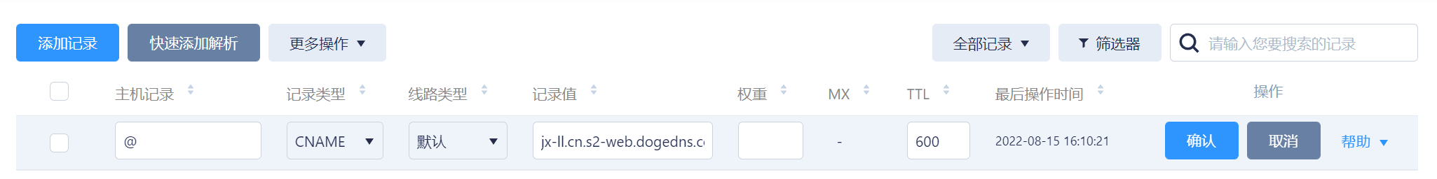 添加好域名后到将域名解析到 DogeCloud ,记录值为 DogeCloud 提供的 CNAME 域名