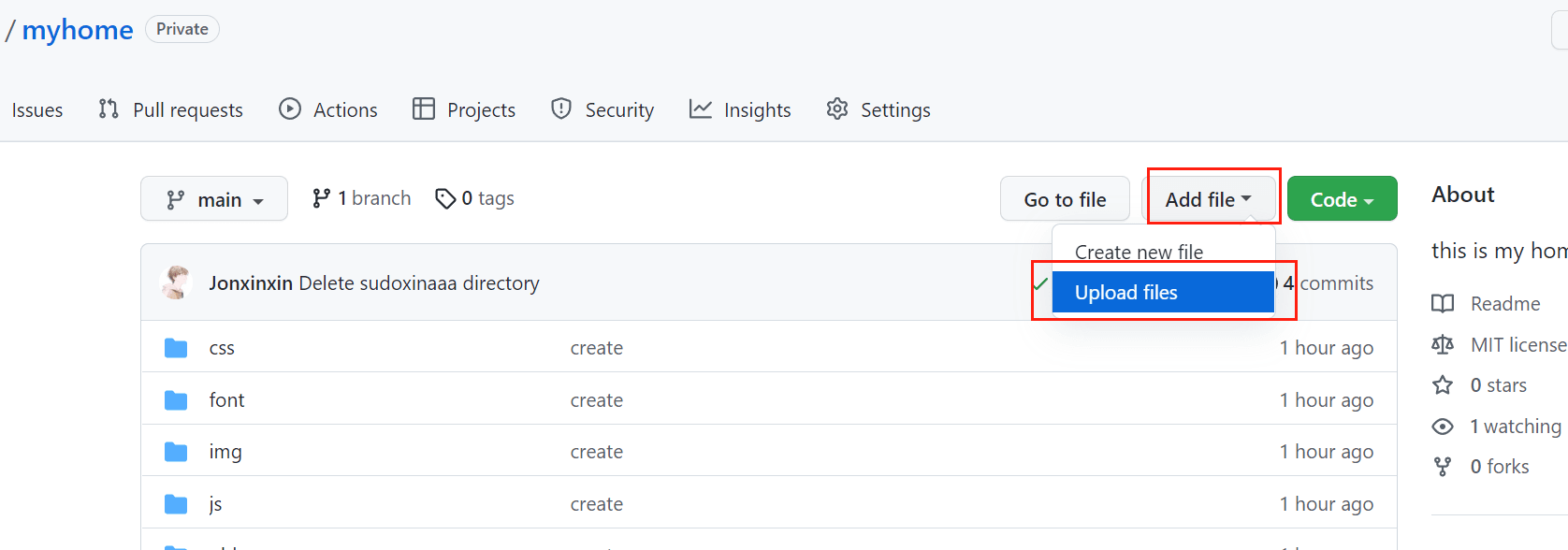 进入 GitHub 项目主页,点击右上角的 Add file -> Upload files 进入到上传页面