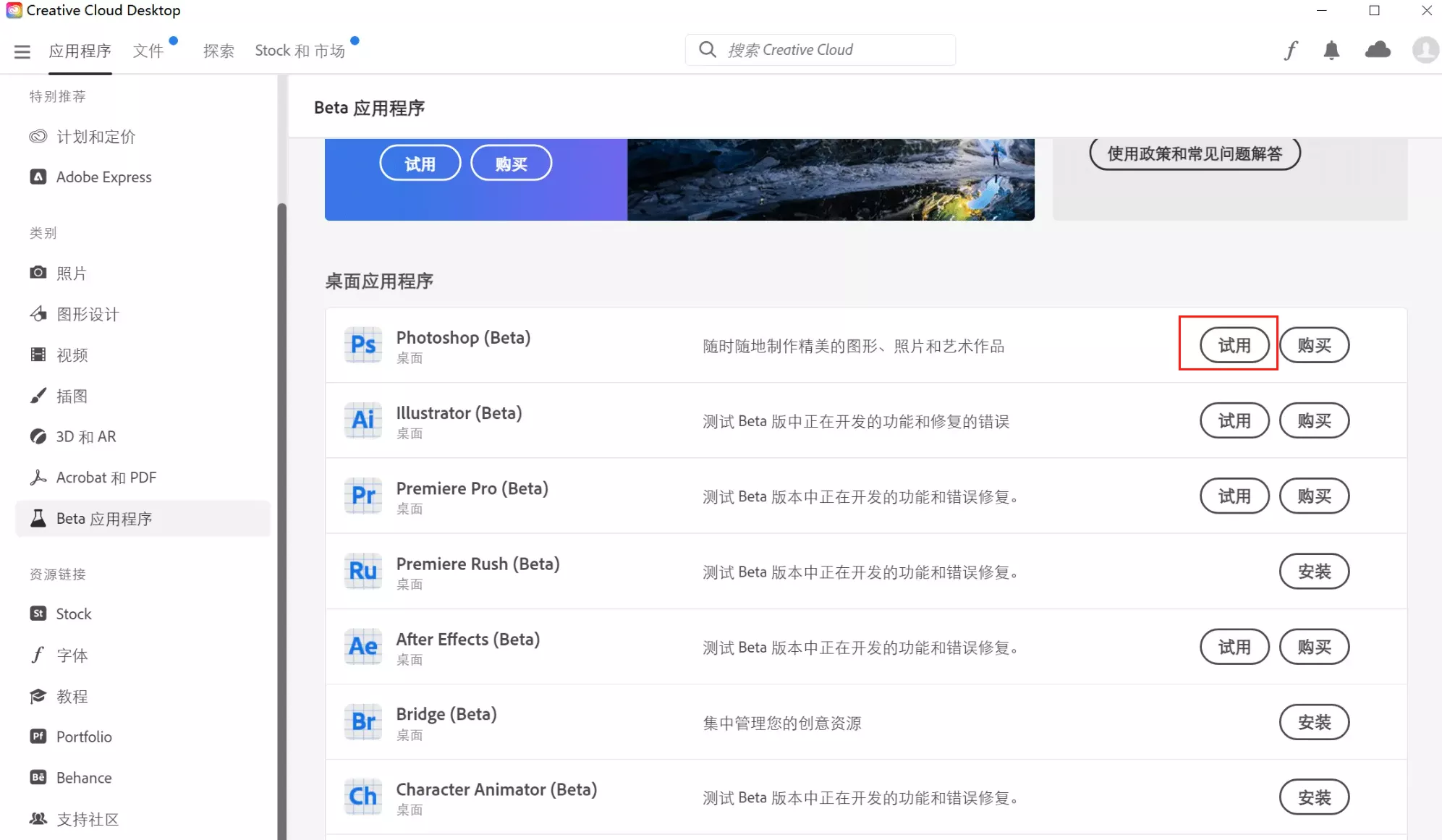 安装后直接打开,在应用程序 -> Beta应用程序 -> Photoshop(Beta)选择试用